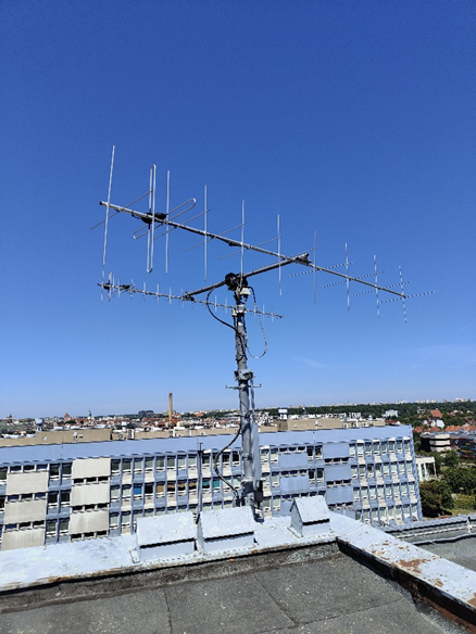 The ground station is located at the Piotrowo campus, on the roof of building A3 (8th floor). Due to this location, antennas can easily track low Earth orbit (LEO) satellites over the entire horizon. The station is composed of two antenna masts with turntables for antennas. The first mast supports multi-element Yagi-Uda antennas for the 144MHz band with a 14,5dB gain and for the 435MHz band with a 17dB gain with circular polarization, along with low-noise preamplifiers. Mounted on the other mast is a 3m parabolic antenna with a 43dB gain equipped with a septum feed transmitter for the 5,8GHz band, and a low-noise amplifier. VHF and UHF bands are popularly used in communications with Cubesat satellites to transmit Telemetry, Tracking and Command (TT&C) signals. The C band, on the other hand, will be used in the fast data transmission system currently under construction at the Institute of Radiocommunications. Next to the masts, we also installed a video recorder for antenna system monitoring, and a weather station collecting data on current weather conditions.