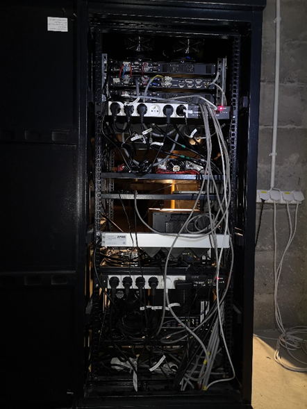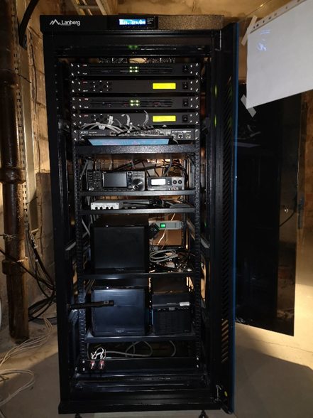 Directly beneath the masts, in the attic of the building, we set up a rack cabinet containing turntable controllers with feeders, as well as transceivers with necessary computer hardware. Signals in VHF and UHF bands are being transmitted using an ICOM IC-9700 radio station, coupled with a PC, whereas te reception is handled by SDR FunCube Dongle and USRP B210 receivers, also coupled with a PC. In the near future, we plan to replace the ICOM station with a transmitter using the SDR USRP B210 module and a high-end 50W amplifier, which would enable transmission speed of over 4800 bit/s, available in the current setup. The ground station is fully remote-controlled by the Management Center located at the Institute of Radiocommunications.